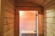 Внутри 3 отделения: комната отдыха (тут комплект нашей фирменной мебели, выносная топка и душевое оборудование), душевая комната (стеклянная дверь, трапик, пластиковый поддон, смеситель и лейка) и парная (обшита кедром, стеклянная дверь, двухуровневые полки, печь на металлическом поддоне). Внимание к деталям и аккуратность — визитная карточка наших бань!