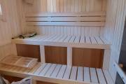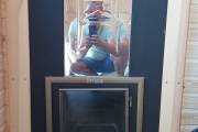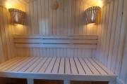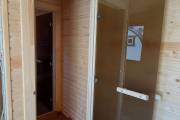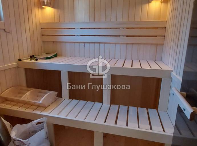 Баня исполнена в стандартной комплектации. Никаких особых наворотов нет, всё самое необходимое. В парной поставлена замечательная печь марки «ПечЪнов» с выносной топкой. Даёт отличный пар, надежный неубиваемый аппарат. Сделаны широкие двухуровневые полки. В углах парной повесили красивые светильники. Есть подсветка нижнего полка.