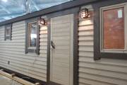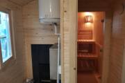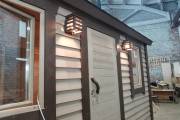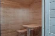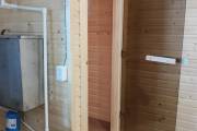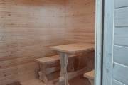 Снаружи баня покрашена в спокойные тона мега-стойкой Тиккурилой. Доски красятся перед сборкой, поэтому даже если будет незначительная усадка, то непрокрашенных участков не появится.
