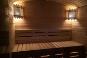 Итак, баня в супер хорошей комплектации: 6 метров, душевая система, покраска «Клён» + «Палисандр» БиоТекс. Наша фирменная каркасная сборка из доски внахлёст. Снаружи и внутри установлено декоративное освещение. Есть душ (с усовершенствованной душевой системой: поддон для конденсата и бак для воды не примыкает вплотную к стене), печь-каменка, комплект мебели, пологи, окна-двери.