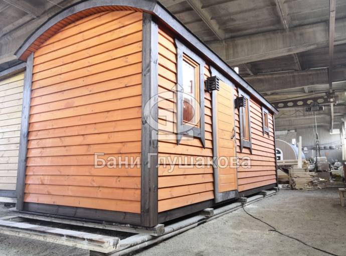 Внимание: эта «Буханочка» была изготовлена для выставочной площадки и уже продана. В наличии её нет. Но образец настолько хорош, что мы решили не удалять его с сайта — ведь всегда можно заказать повтор точно такой же бани или с любыми изменениями.