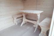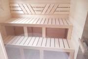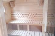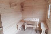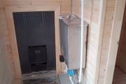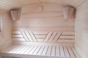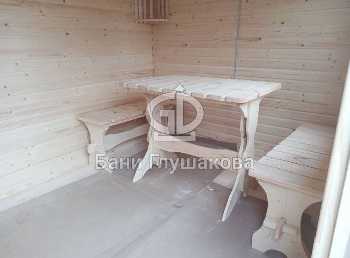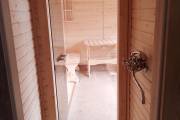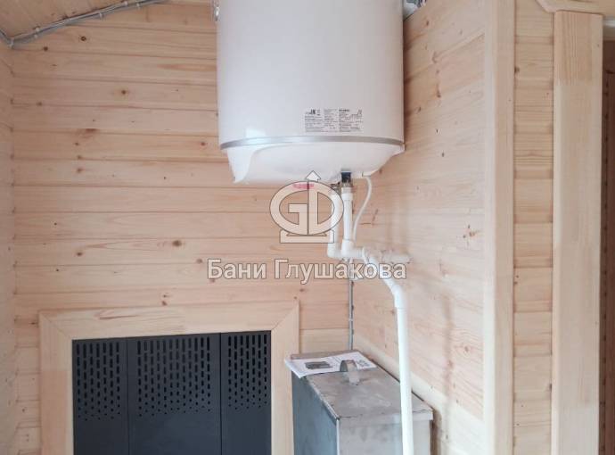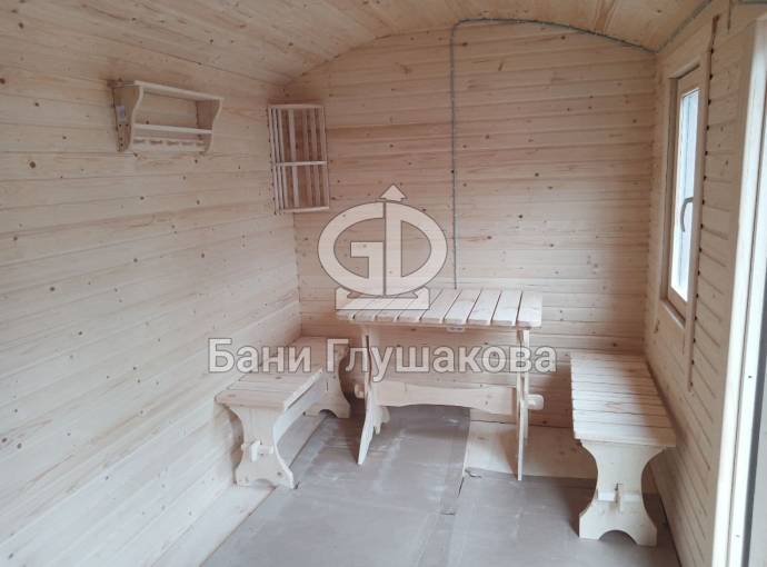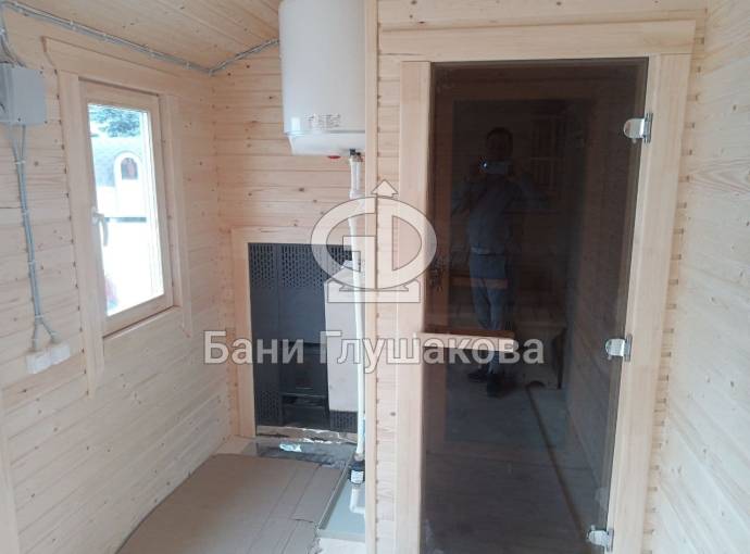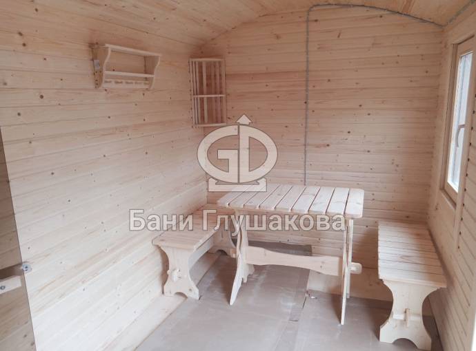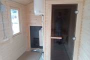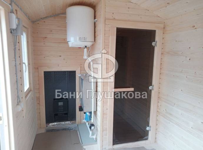 Внутри 3 помещения: комната отдыха, парная и душевая кабина. Установлена автономная душевая система с бойлером и насосом. В парной стоит компактная, красивая и мега-мощная печь Костёр Релакс 14 с отличной парогенерацией.