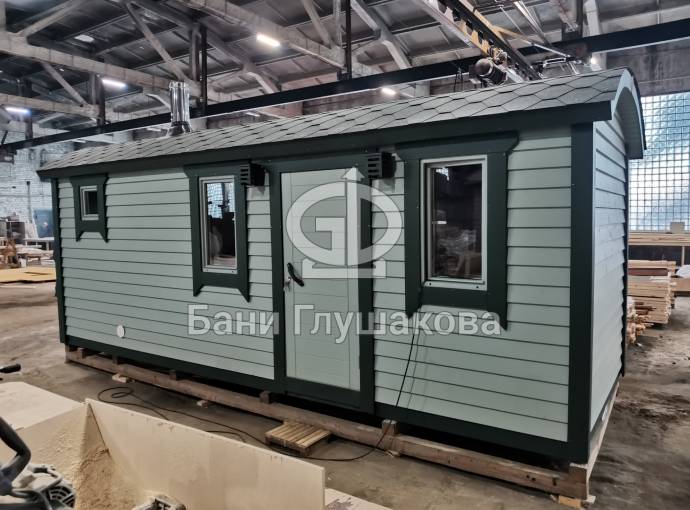Это премиальная перевозная баня «Буханочка» каркасной сборки. Шестиметровая, на 3 отделения: комната отдыха, душевая, сауна.