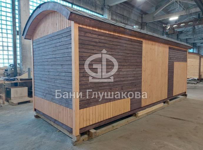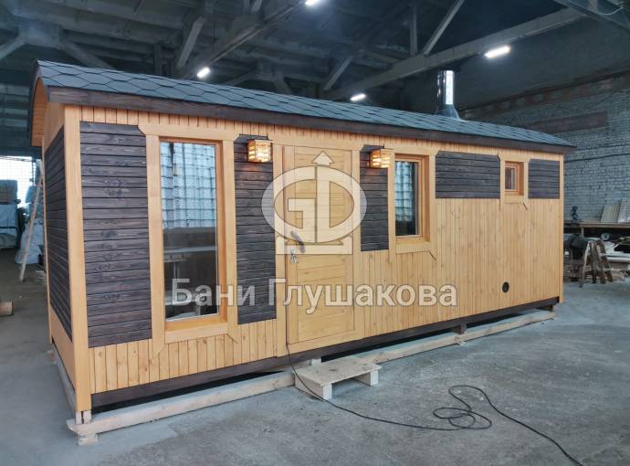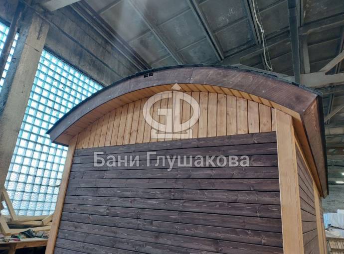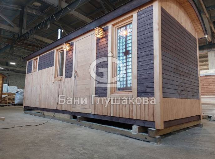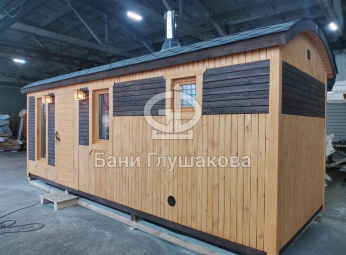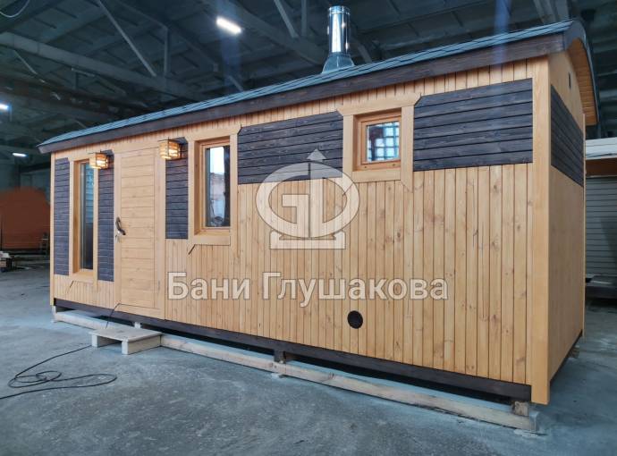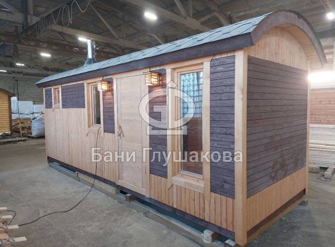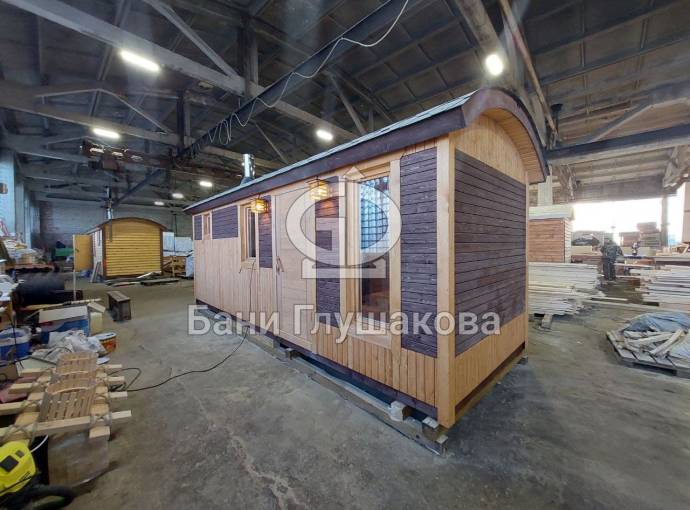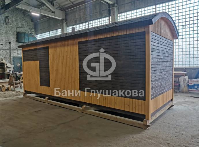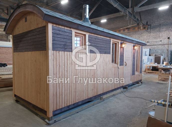 Проект запущен в серийное производство. Сборка такой бани с выездом на участок невозможна. Строим только в цеху — и привозим уже в собранном виде на ваш участок.