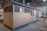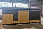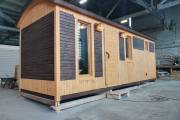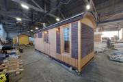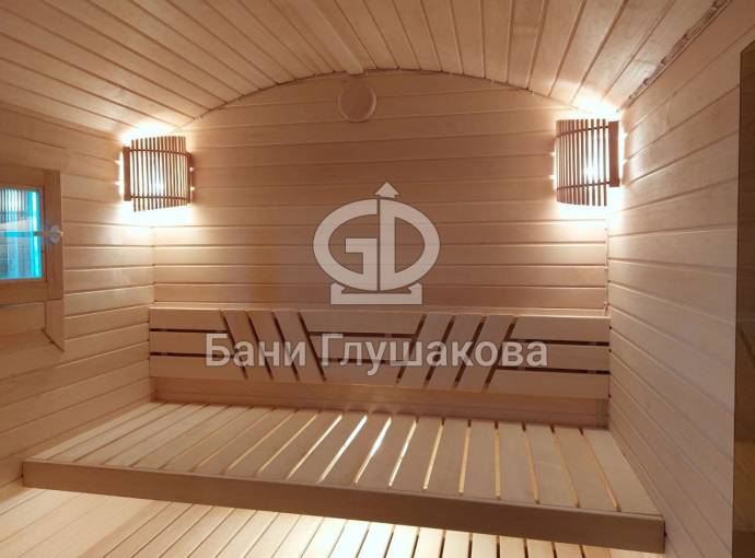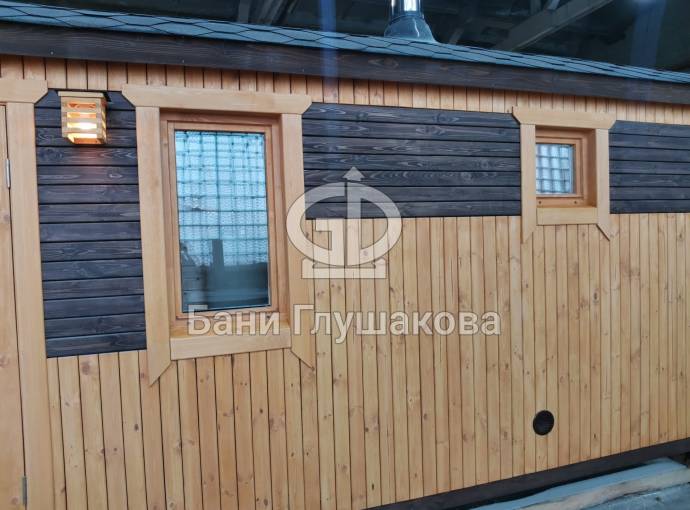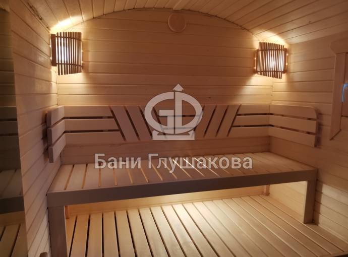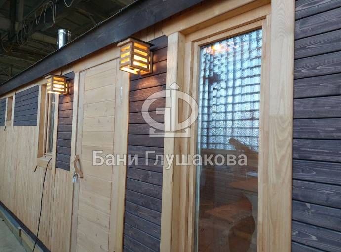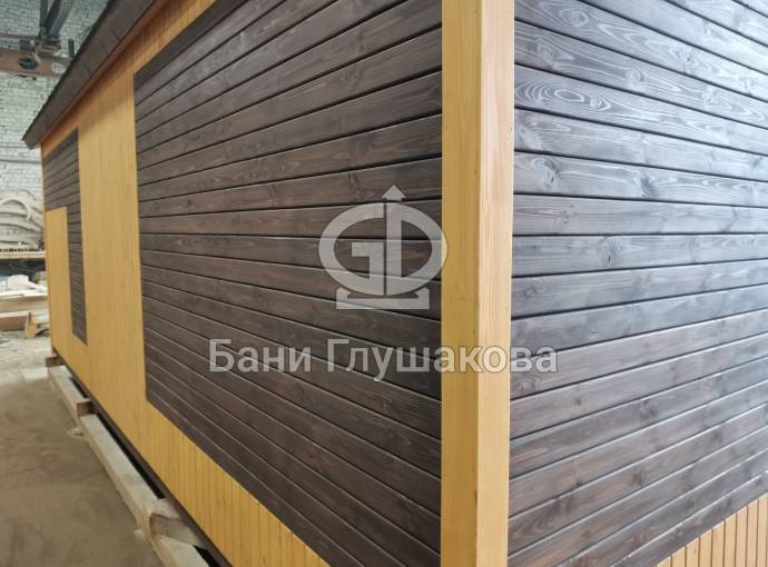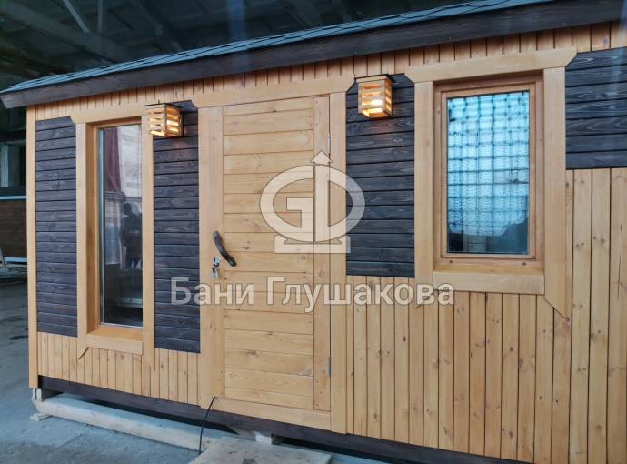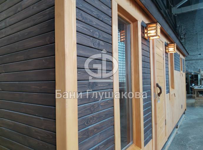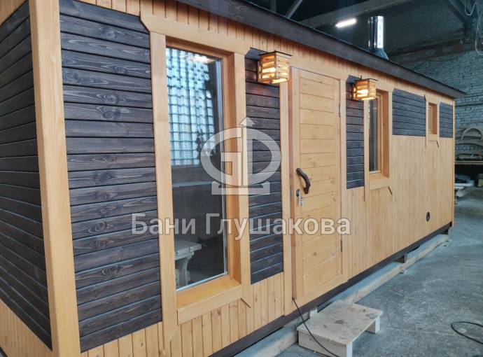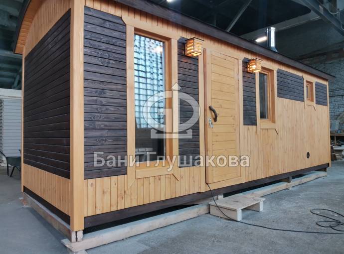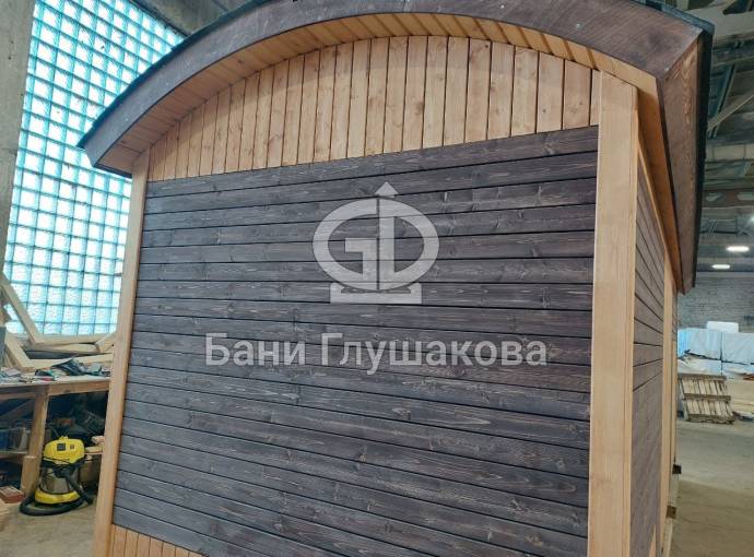 Проект запущен в серийное производство. Сборка такой бани с выездом на участок невозможна. Строим только в цеху — и привозим уже в собранном виде на ваш участок.