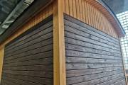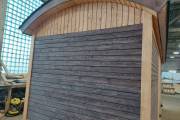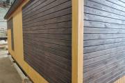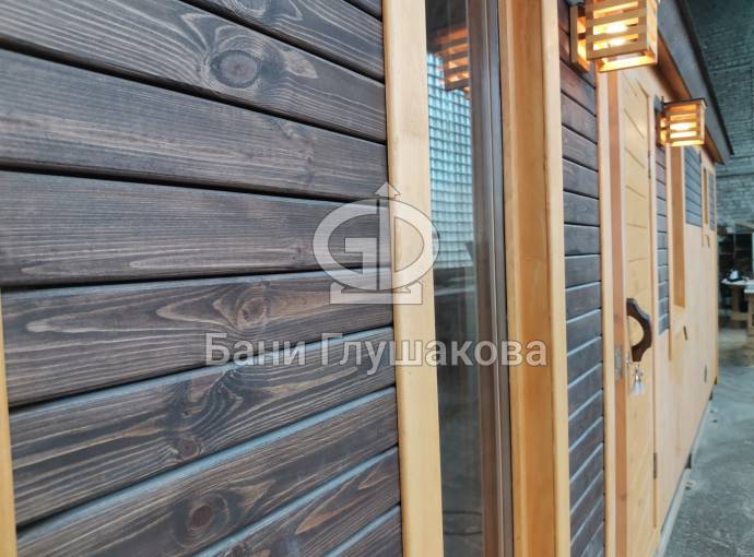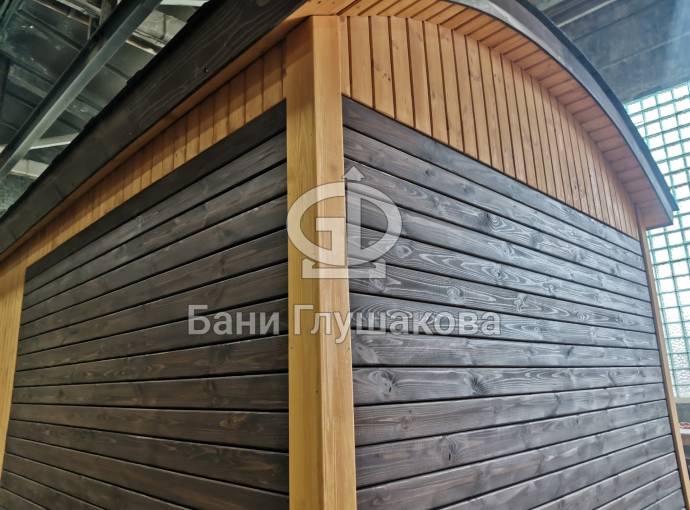 Сухая, строганная, покрашенная и только потом установленная доска внахлест одна на другую, (если это баня «Барн», то обшивается имитацией бруса), если баня «Кубота», то планкеном.