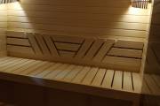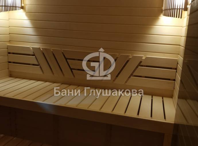 Парная получилась очень уютная: красивые абажуры, симпатичная спинка полка. Полки, кстати, без ножек. Многие наши клиенты оценили эту опцию. Говорят, что поддерживать чистоту очень удобно и можно поставить тазики.