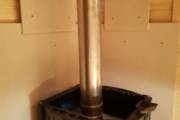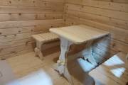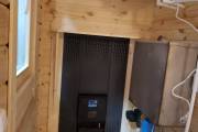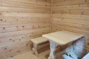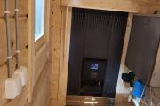 Внутри 3 помещения: парная, душевая и комната отдыха. Всё оборудовано в наших лучших традициях: поставлен добротный комплект мебели для бани, сделана аккуратная электропроводка, повешена дизайнерская люстра, поставлены душевая система и отличная по качеству и дизайну печь Костёр Рейн 16 — она даёт отличный пар (сами проверяли).