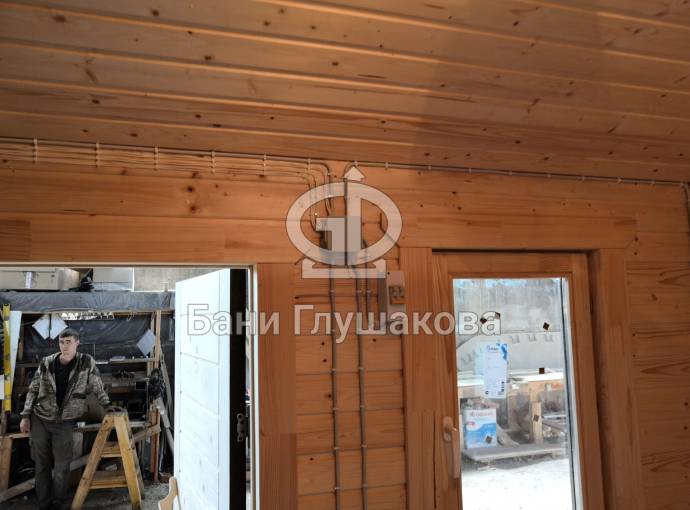 Для строительства и отделки использованы качественные дорогие материалы и комплектующие: бессучковая вагонка А класса, стеклянная дверь на магните, надежные деревянные стеклопакеты, входная дверь собственного производства (делаем специально для наших бань), аккуратная электропроводка, автоматы, черепица Технониколь SHINGLAS, вентиляция.