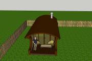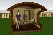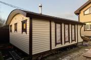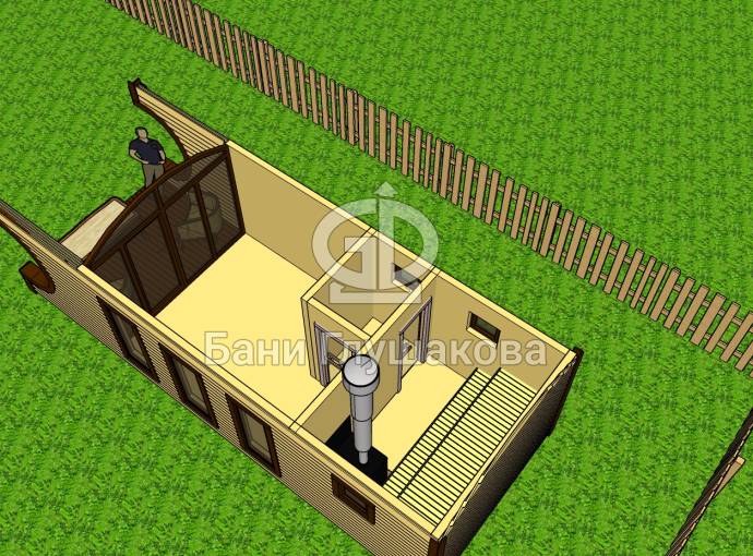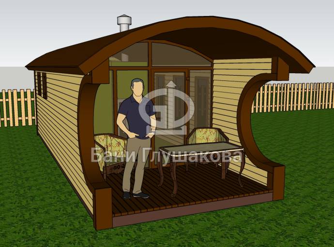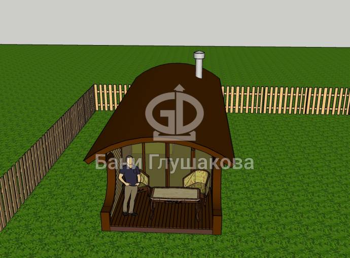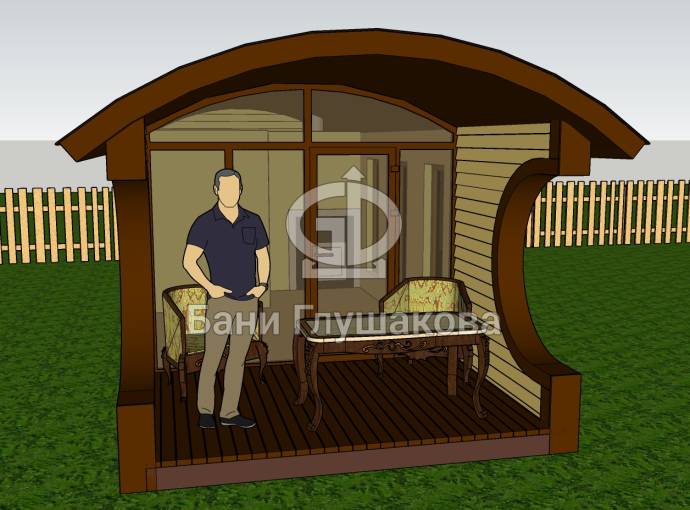 Баня оснащена относительно большой террасой 2 на 3 метра. Пол террасы вымощен композитной доской. Боковые стены украшены округлыми вырезами — они составляют симпатичный дуэт с фирменной округлой крышей.