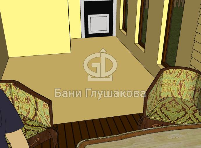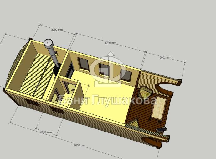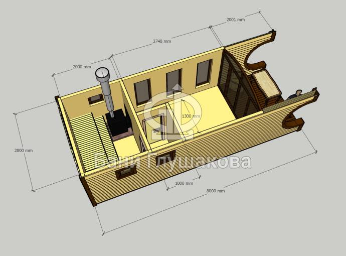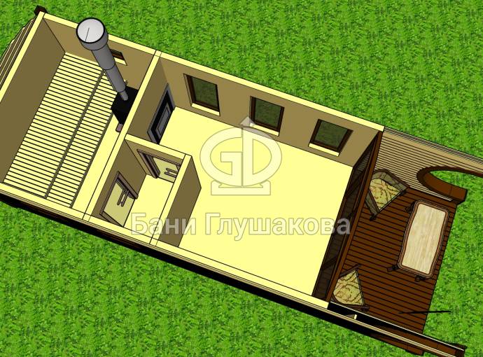 Особая прелесть этой бани заключается в фасадном остеклении. В настоящее время мы отправили запрос на расчёт стоимости изготовления стеклопакета по нашим размерам. Как только завод вышлет прайс, мы опубликуем цену бани «Буханочка Панорама» на нашем сайте.