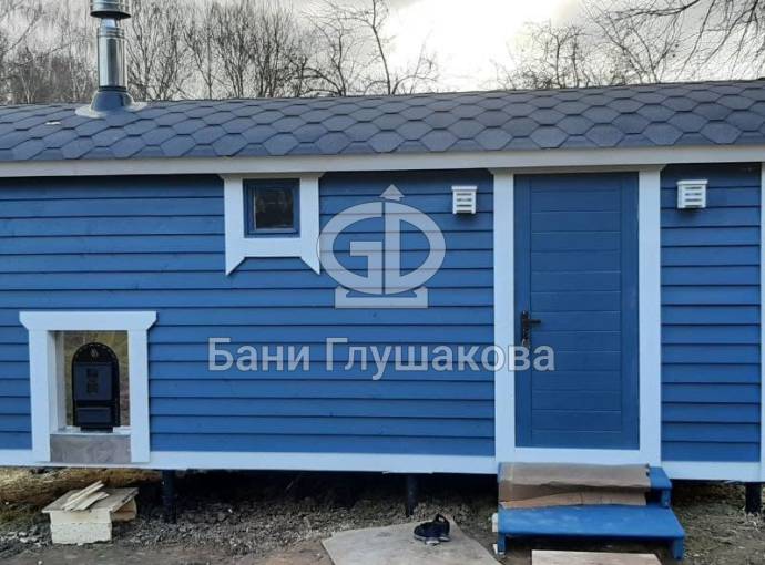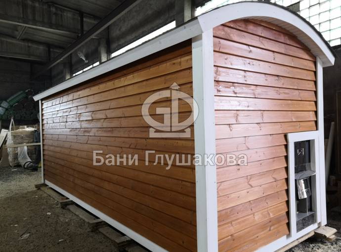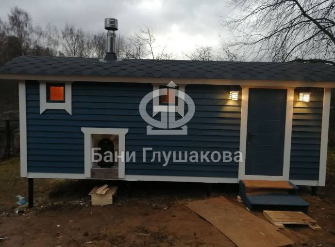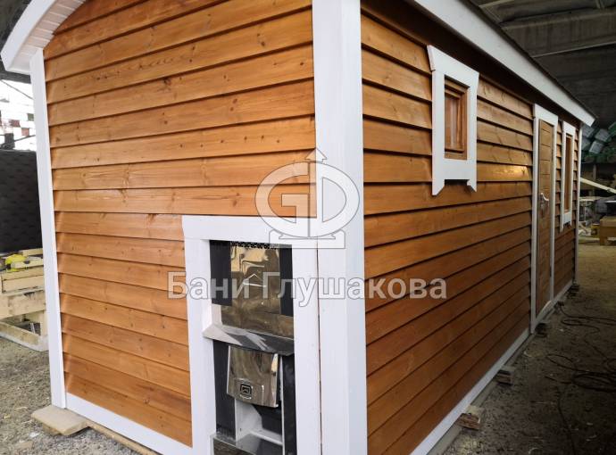 На фото баня «Буханочка» по индивидуальному заказу с нетиповой планировкой и выносной топкой на улицу. Такую баню можно сделать только в каркасном исполнении (именно с таким расположением топки и печи).