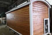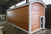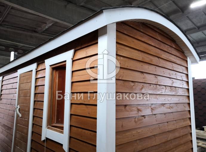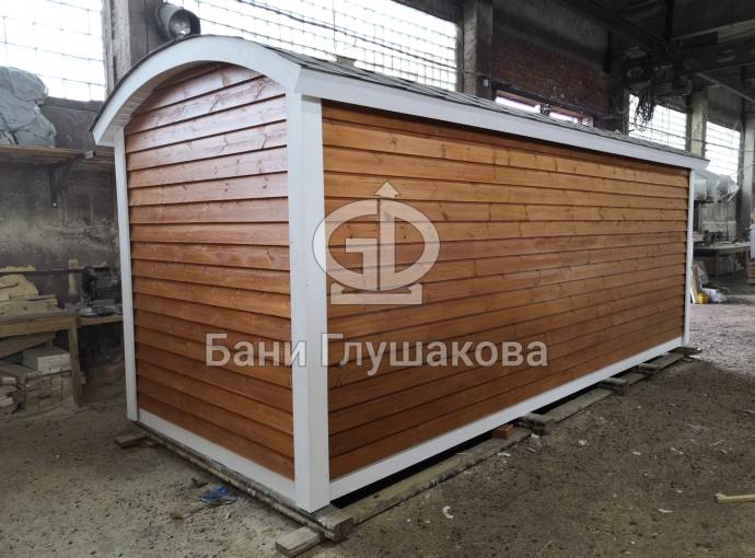 Сухая, строганная, покрашенная и только потом установленная доска внахлест одна на другую, (если это баня «Барн», то обшивается имитацией бруса), если баня «Кубота», то планкеном.