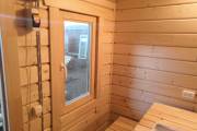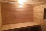 Это перевозная баня и собрана она из хвойного клееного бруса 90х140. Брус мы делаем сами: еловые ламели под прессом склеиваются финским составом KIILTO. После пилим профиль. В нашем случае это классический шип-паз с удлиненными наплывами по бокам. Эти лишние 2 см наплыва дают неоценимое преимущество: соединение получается герметичным, и возможность образования щелей мизерна.