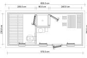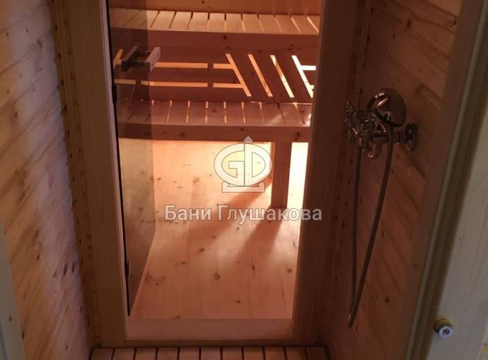 Планировка «Буханочки» позволяет отвести отдельное маленькое помещение под душевую кабину или вывести смеситель с лейкой непосредственно в парную.