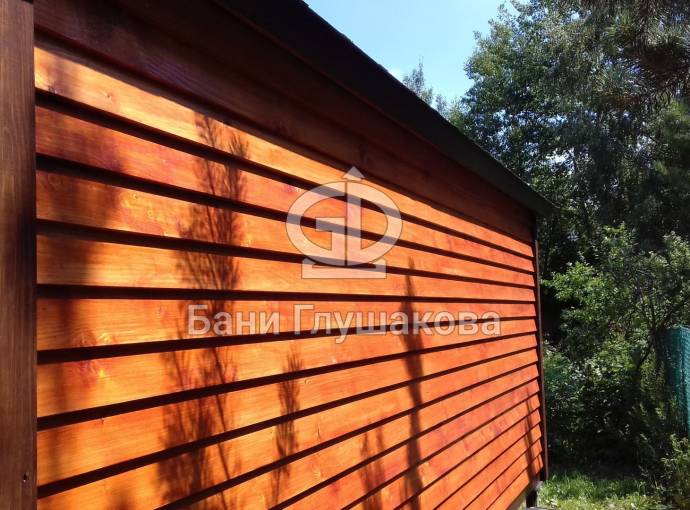 Сухая, строганная, покрашенная и только потом установленная доска внахлест одна на другую, (если это баня «Барн», то обшивается имитацией бруса), если баня «Кубота», то планкеном.