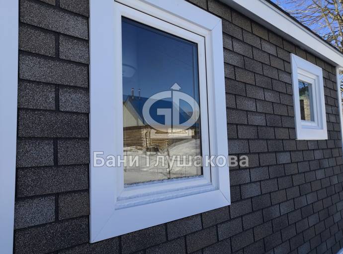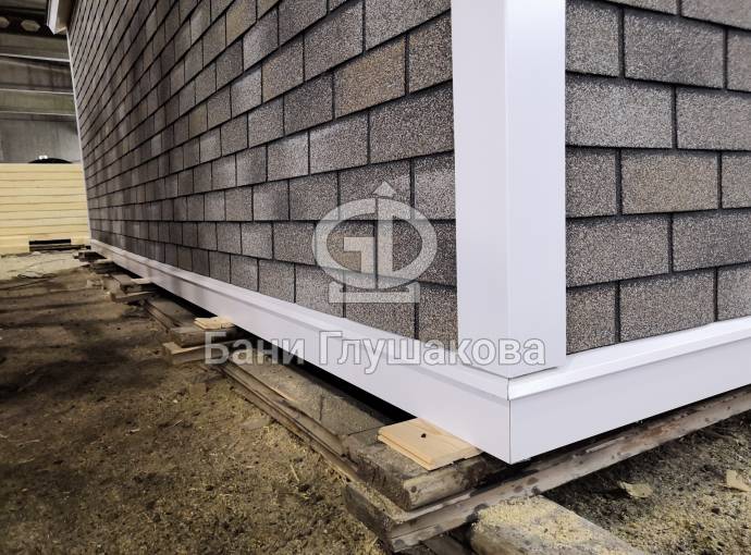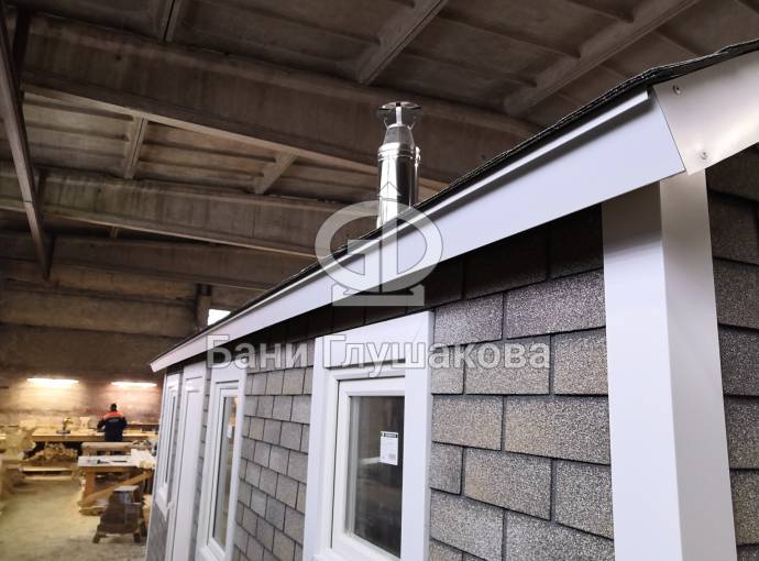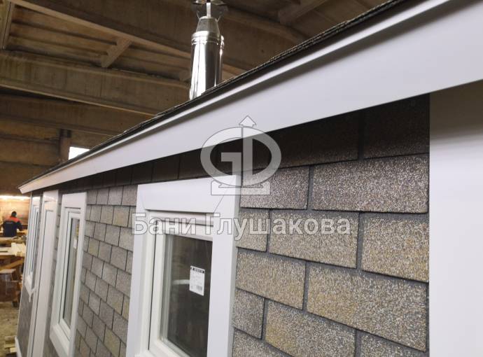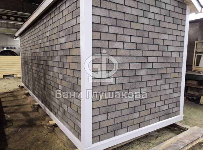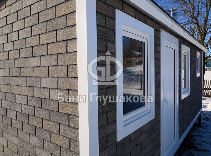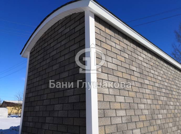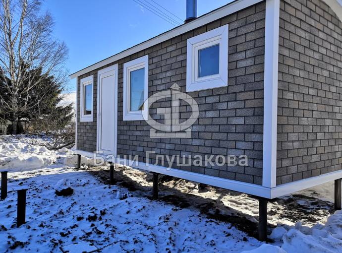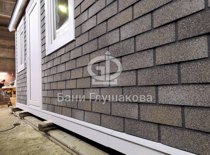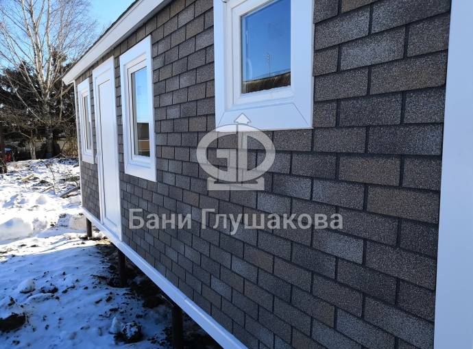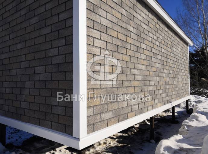 Это пример бани по новой для нас технологии. Она так же собирается по каркасной технологии, однако снаружи не будет ни одного деревянного элемента. Отделка выполнена металлом и мягкой фасадной плиткой ТЕХНОНИКОЛЬ HAUBERK.