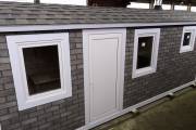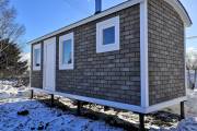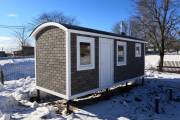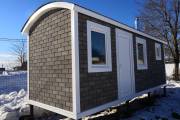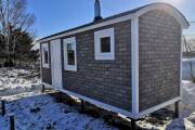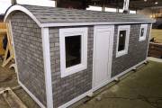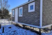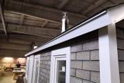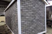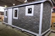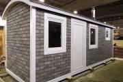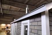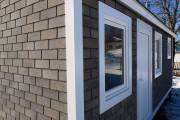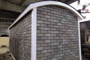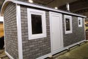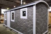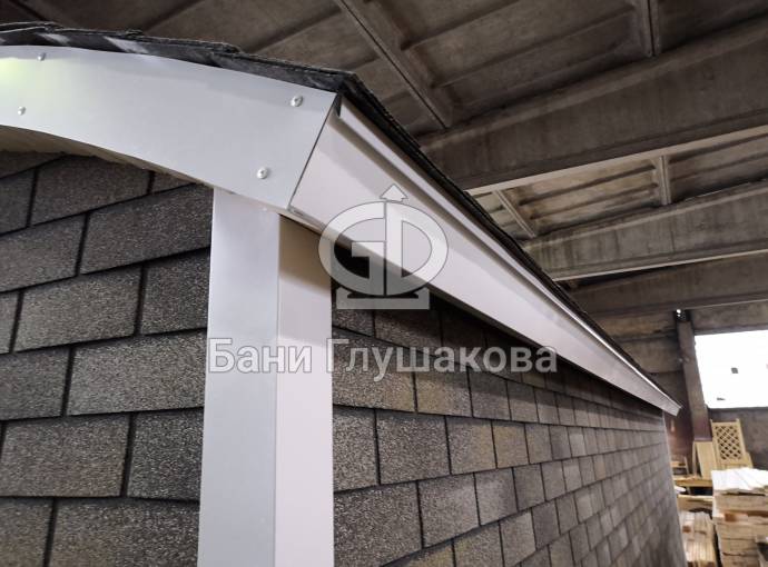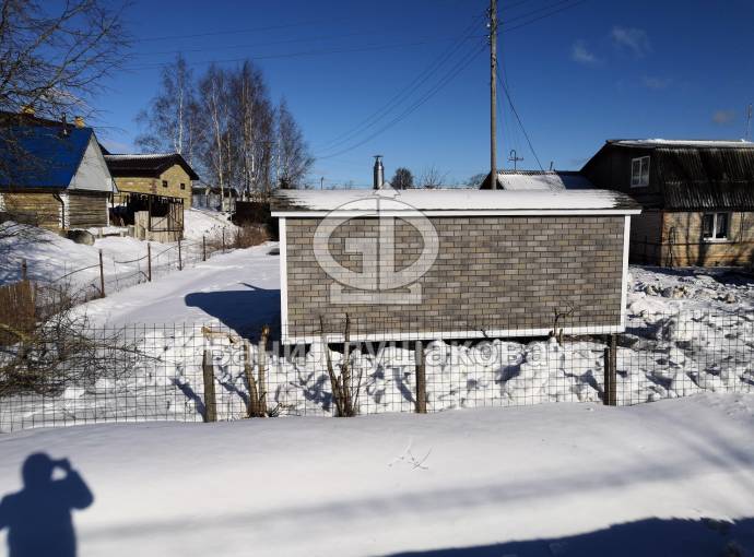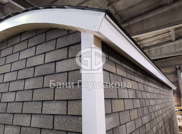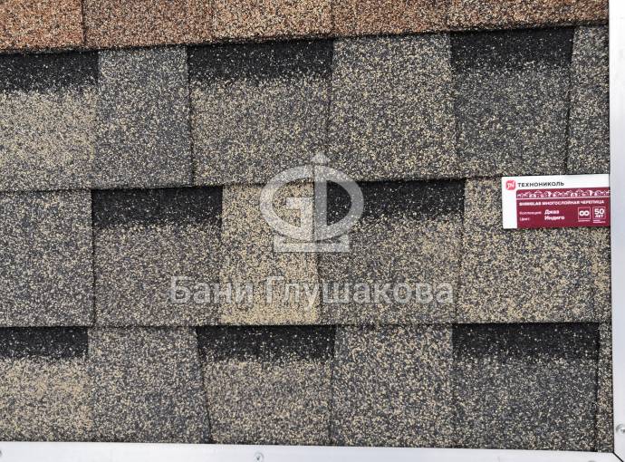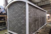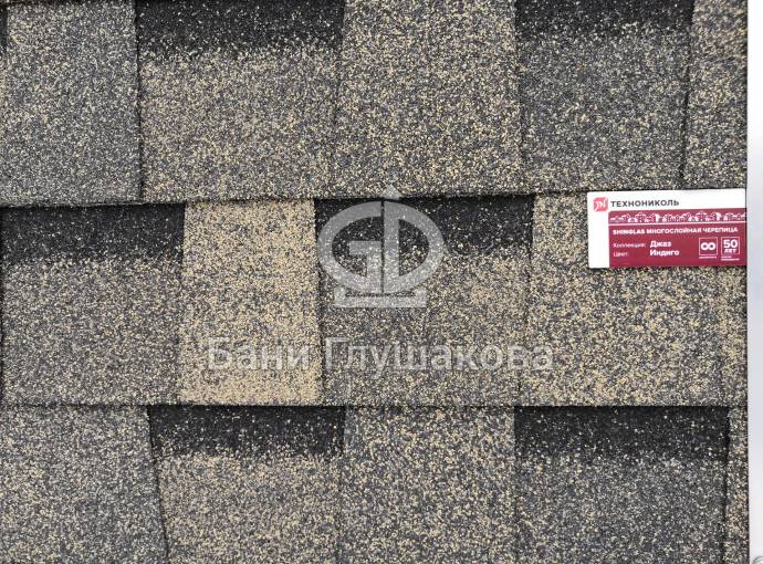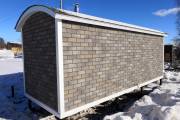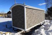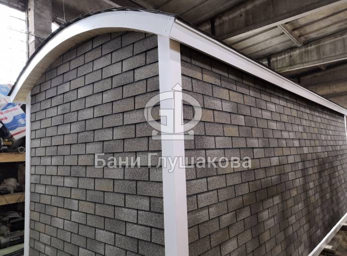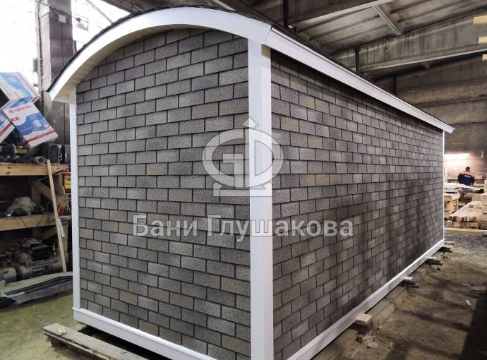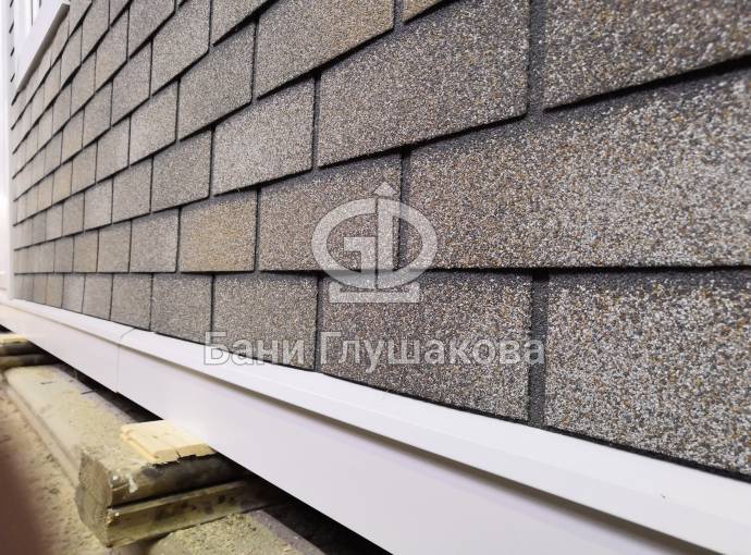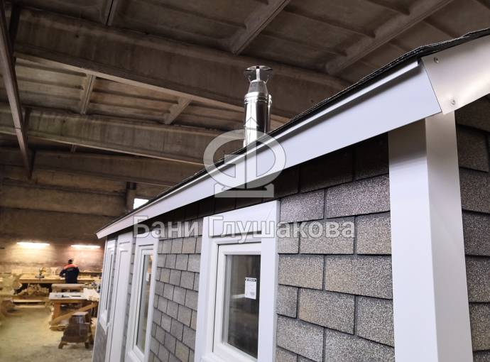 Это пример бани по новой для нас технологии. Она так же собирается по каркасной технологии, однако снаружи не будет ни одного деревянного элемента. Отделка выполнена металлом и мягкой фасадной плиткой ТЕХНОНИКОЛЬ HAUBERK.
