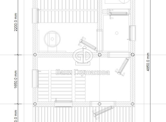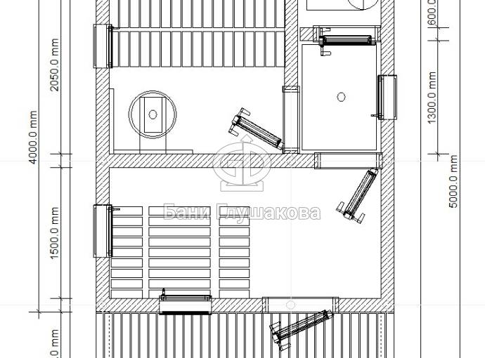 Размеры на плане — это размеры по брусу. Размеры парной и душевой комнаты будут меньше на 60 мм из-за того, что будет контр-обрешётка по стенам и обшивка вагонкой изнутри — ну то есть несколько сантиметров площади неизбежно «съедятся».