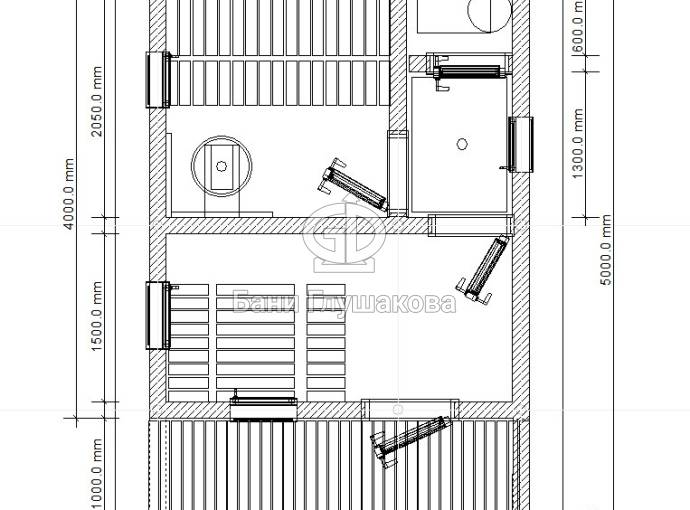 Размеры на плане — это размеры по брусу. Размеры парной и душевой комнаты будут меньше на 60 мм из-за того, что будет контр-обрешётка по стенам и обшивка вагонкой изнутри — ну то есть несколько сантиметров площади неизбежно «съедятся».