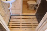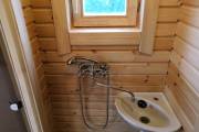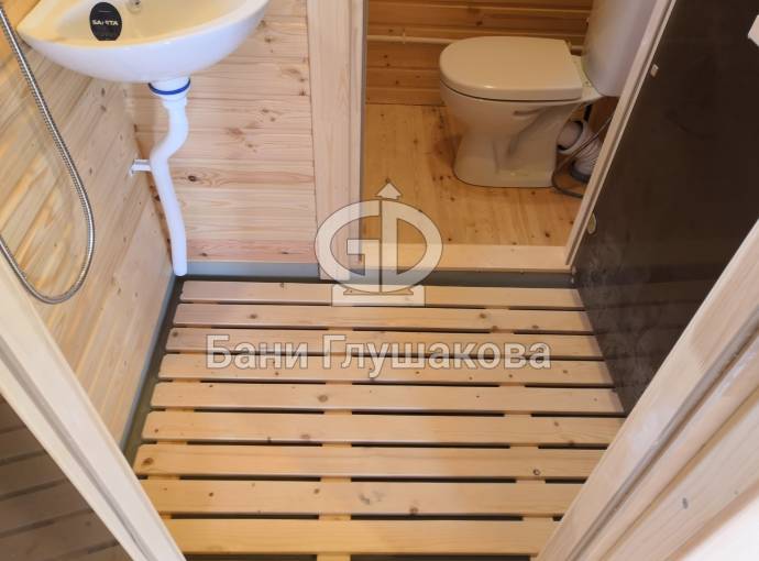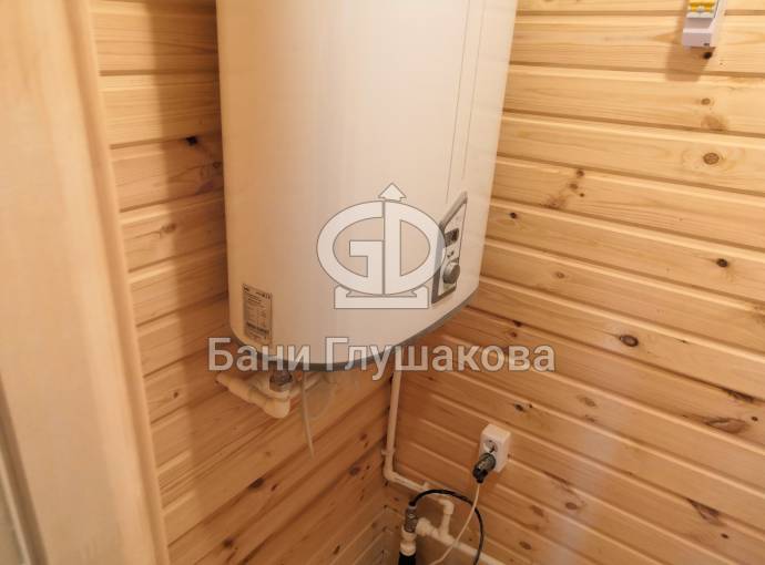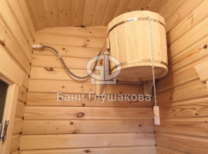 В бане установлена автономная душевая система с бойлером. В душе под трапиком расположен пластиковый поддон с сифоном. По желанию клиента установлены бак для обливания водой, раковина и унитаз.