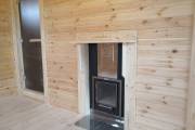 Если топка через стену то можно сделать красивые наличники из брашированной доски с полочкой на верху,