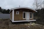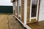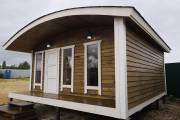 Сухая, строганная, покрашенная и только потом установленная доска внахлест одна на другую, (если это баня «Барн», то обшивается имитацией бруса), если баня «Кубота», то планкеном.