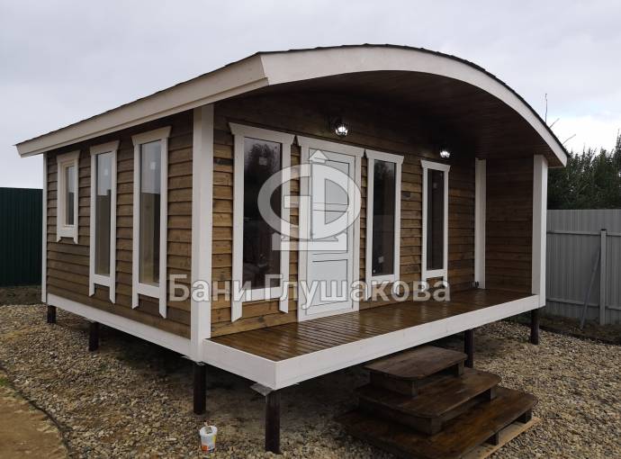 Представляем вам потрясающе красивый проект каркасной бани 5 на 5 метров «Бурже» с округлой крышей и террасой. Это полноформатная баня, которая строится на участке. Планировка очень удобная и включает в себя комнату отдыха, душевую кабину и парную. Для удобства топка со стеклянной дверцей вынесена в комнату — создаётся ощущение полноценного камина!