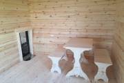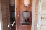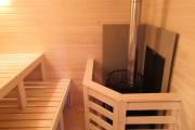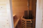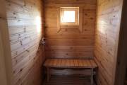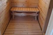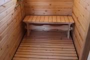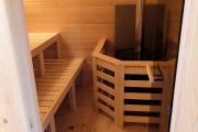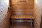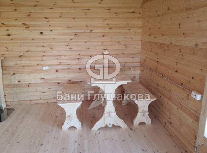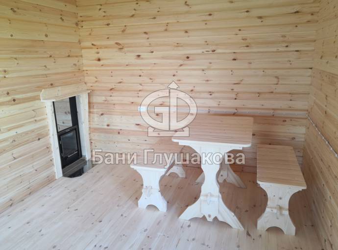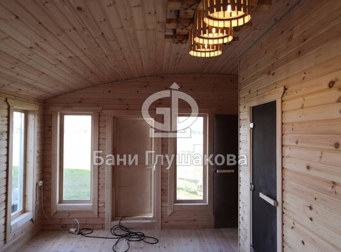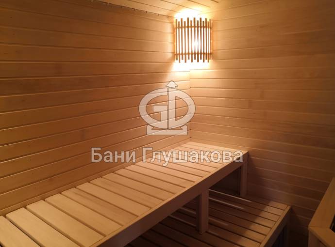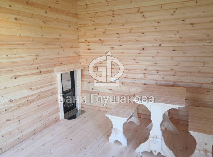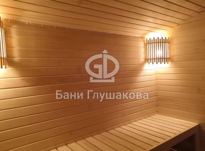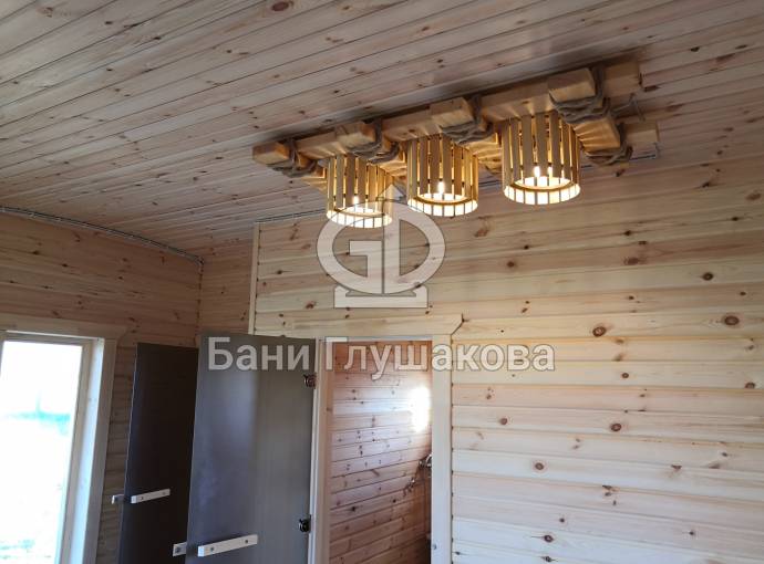 В комнате отдыха сделана выносная топка с панорамным стеклом (ощущение камина!), а вокруг — портик. Повешена люстра «Тринити». В помывочной установлен пластиковый поддон во всю площадь помещения, сверху положены два трапика, есть форточка.