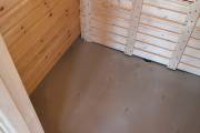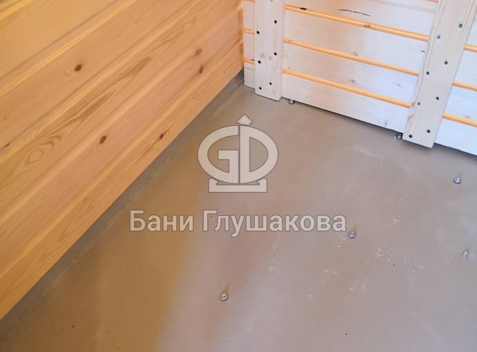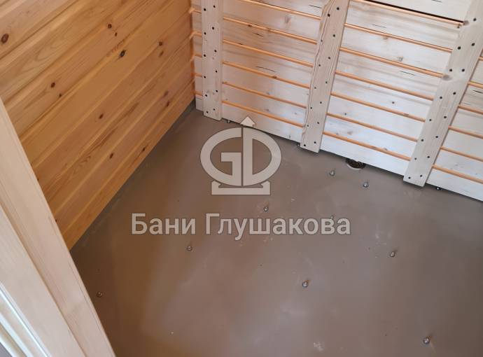 Установлен в помывочном отделении пластиковый герметичный поддон с сифоном для слива воды, в него вложен деревянный трапик (в планировках, где подразумевается душевое помещение). Ссылка на фото и видео