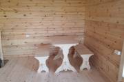 Массивная мебель нашего производства, основа из фанеры, верх из массива, стол и две скамейки, есть табуреты но их нужно оговаривать отдельно.