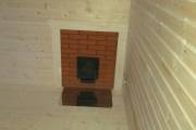 Если топка через стену то можно сделать красивые наличники из брашированной доски с полочкой на верху,