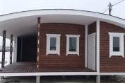 Сухая, строганная, покрашенная и только потом установленная доска внахлест одна на другую, (если это баня «Барн», то обшивается имитацией бруса), если баня «Кубота», то планкеном.
