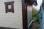 Сухая, строганная, покрашенная и только потом установленная доска внахлест одна на другую, (если это баня «Барн», то обшивается имитацией бруса), если баня «Кубота», то планкеном.