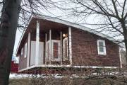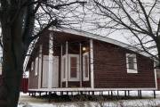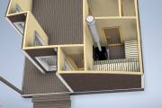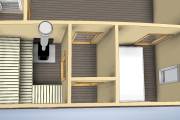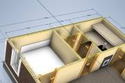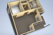Это младшая модель в размере 6 на 6 метров с небольшой террасой. Проект можно использовать для строительства дачного или гостевого домика — планировкой предусмотрены спальня, большая кухня-гостиная, санузел, душ, парная.