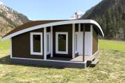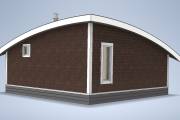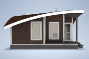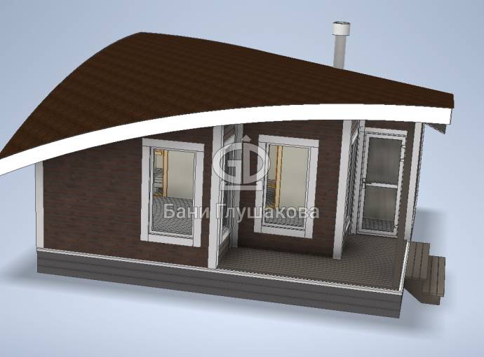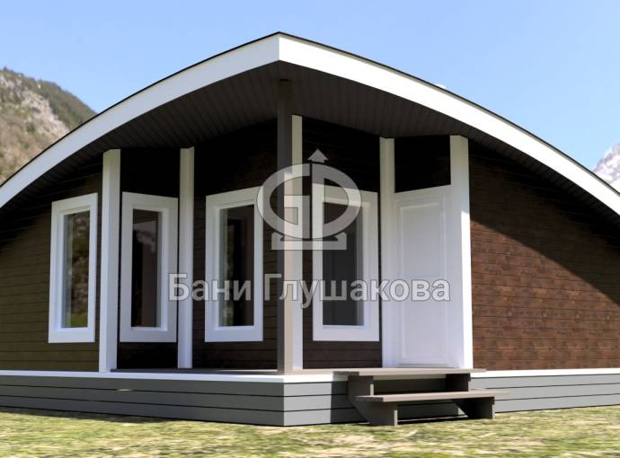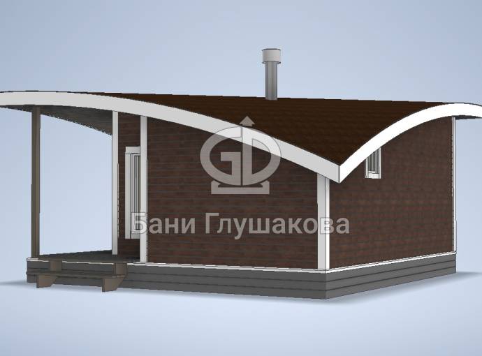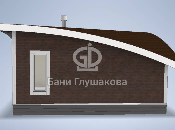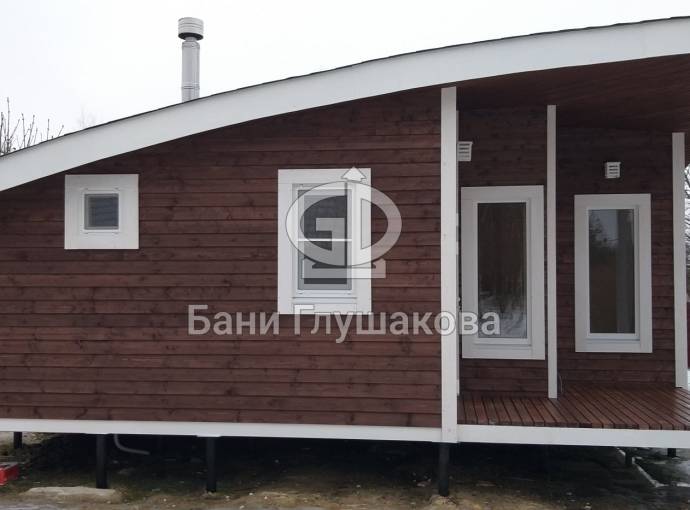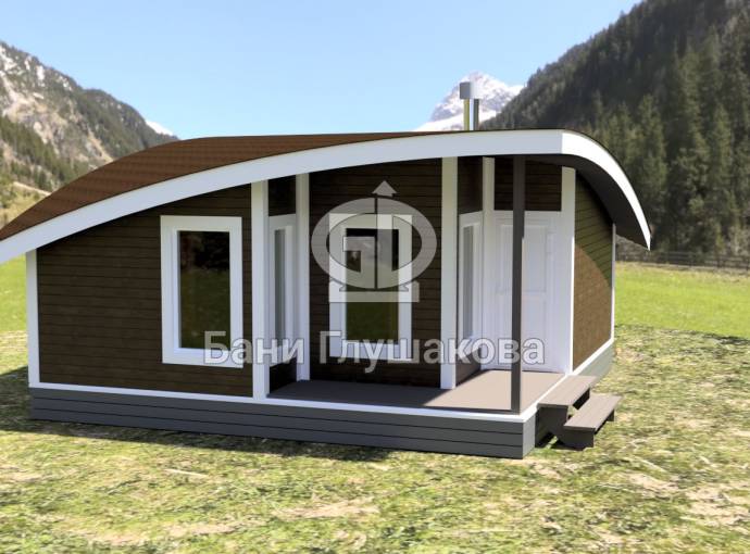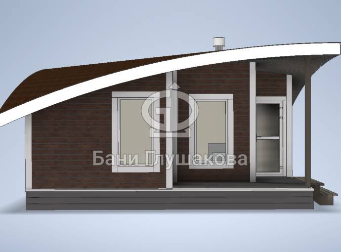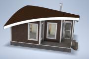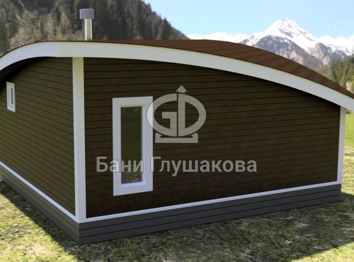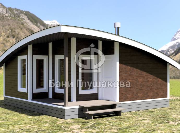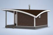 Главная особенность нового проекта — оригинальная округлая односкатная крыша с разной высотой сзади и спереди. Смелое прорывное решение. Такая баня точно не останется незамеченной вашими соседями.