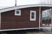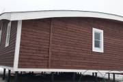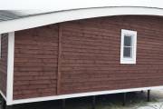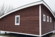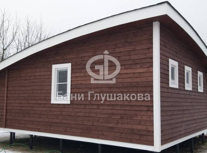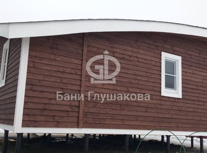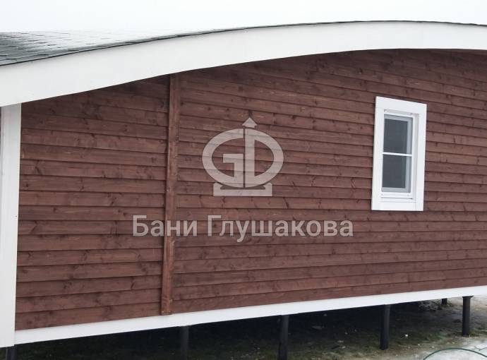 Сухая, строганная, покрашенная и только потом установленная доска внахлест одна на другую, (если это баня «Барн», то обшивается имитацией бруса), если баня «Кубота», то планкеном.