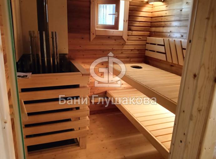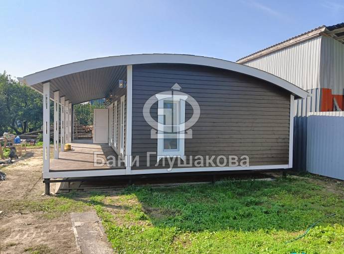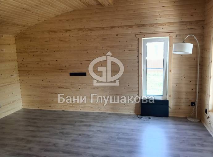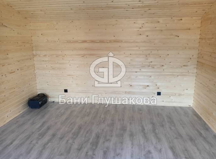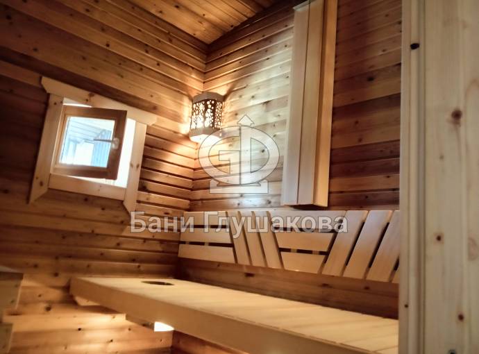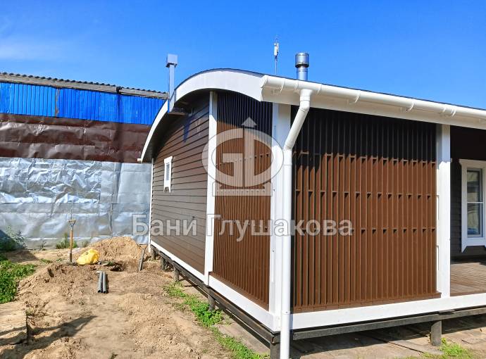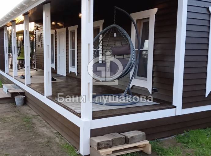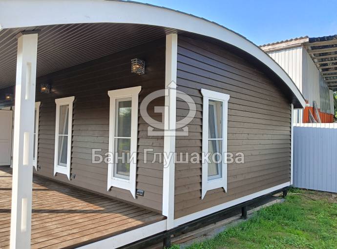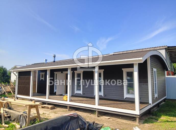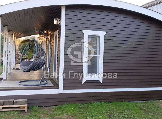 Баня изготовлена по каркасной технологии, однако может быть построена и из бруса.