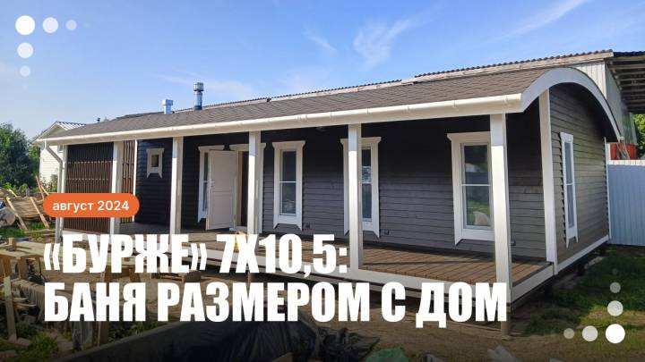 Баня размером с дом – это новый проект «Бурже» с огромной террасой. Размер 7 на 10.5 метров и почти 135 квадратов площади: эта баня спокойно заменит собой дачу!