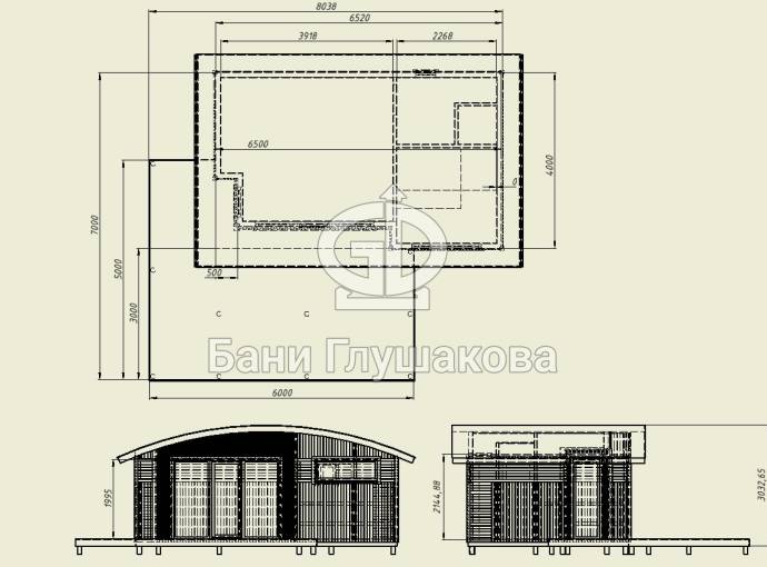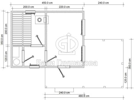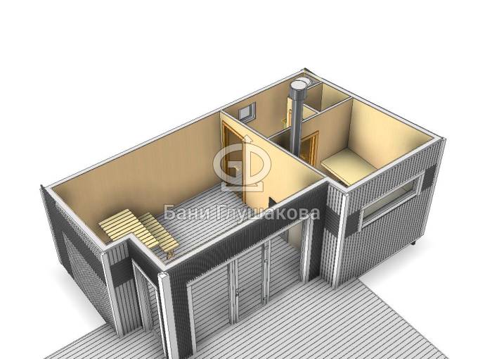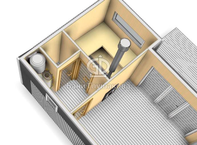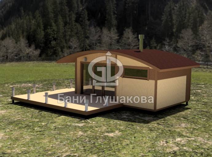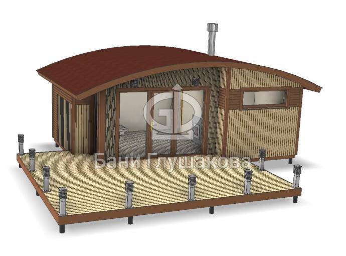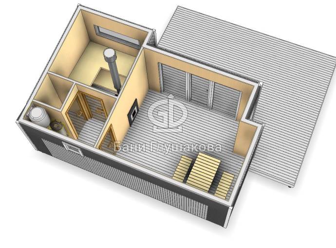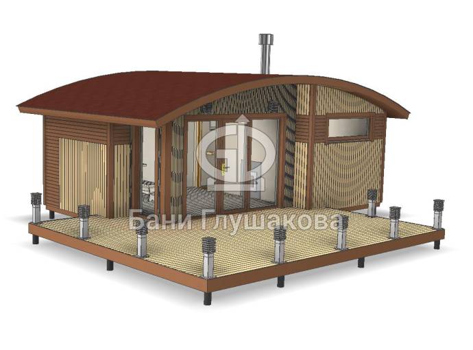 Эта баня размером 4 на 6,5 метров, однако возможны и другие варианты на ваше усмотрение.