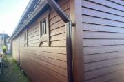 Сухая, строганная, покрашенная и только потом установленная доска внахлест одна на другую, (если это баня «Барн», то обшивается имитацией бруса), если баня «Кубота», то планкеном.