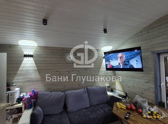 Можно установить светильник потолочный в комнате отдыха, ссылка на все фото тут, помещается в бани бочки увеличенного диаметра, в Буханочки и Бурже, беседки