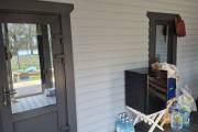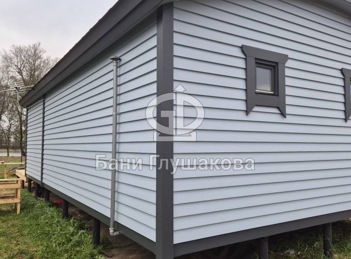 Сухая, строганная, покрашенная и только потом установленная доска внахлест одна на другую, (если это баня «Барн», то обшивается имитацией бруса), если баня «Кубота», то планкеном.