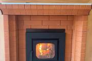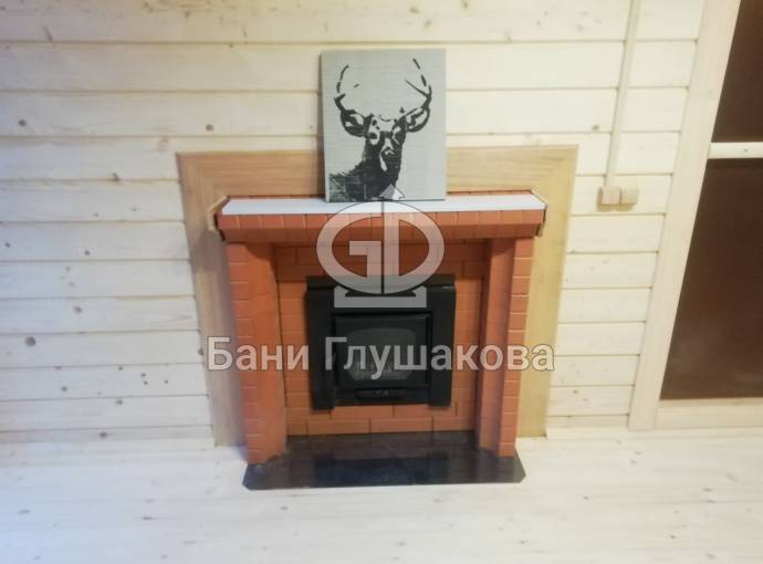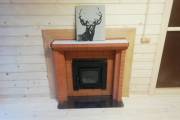 Если топка через стену то можно сделать красивые наличники из брашированной доски с полочкой на верху,