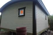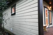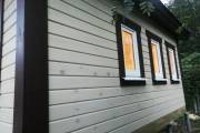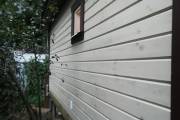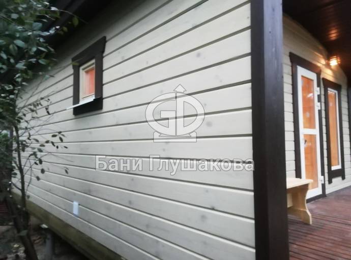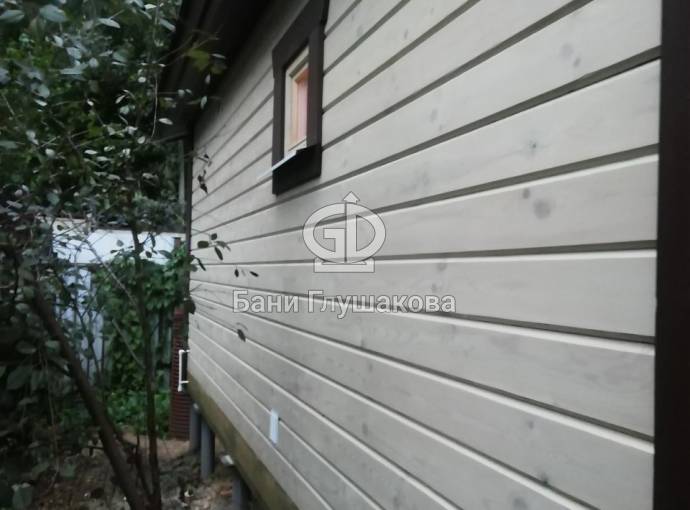 Сухая, строганная, покрашенная и только потом установленная доска внахлест одна на другую, (если это баня «Барн», то обшивается имитацией бруса), если баня «Кубота», то планкеном.