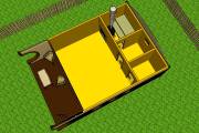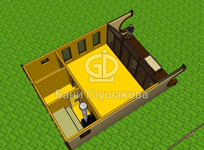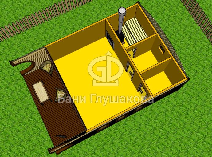 Внутри 4 помещения: комната отдыха, парная, душевая и санузел. Такая баня вполне заменит собой дачу или гостевой домик на участке. Также может быть построена в качестве отдельного жилого номера на базе отдыха.