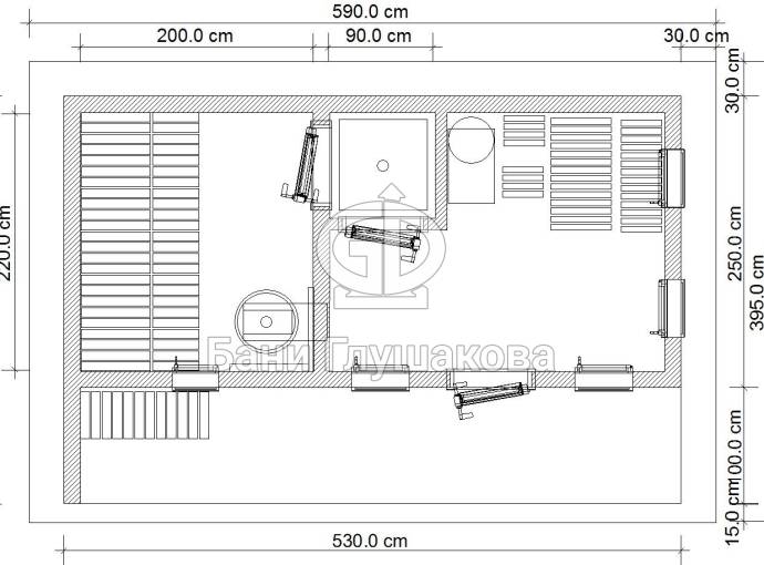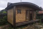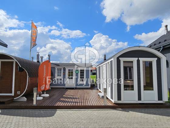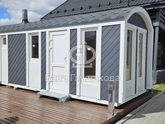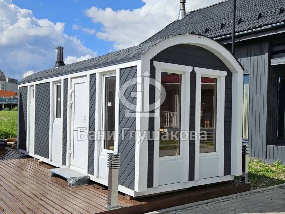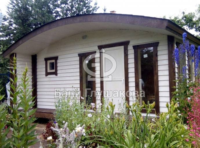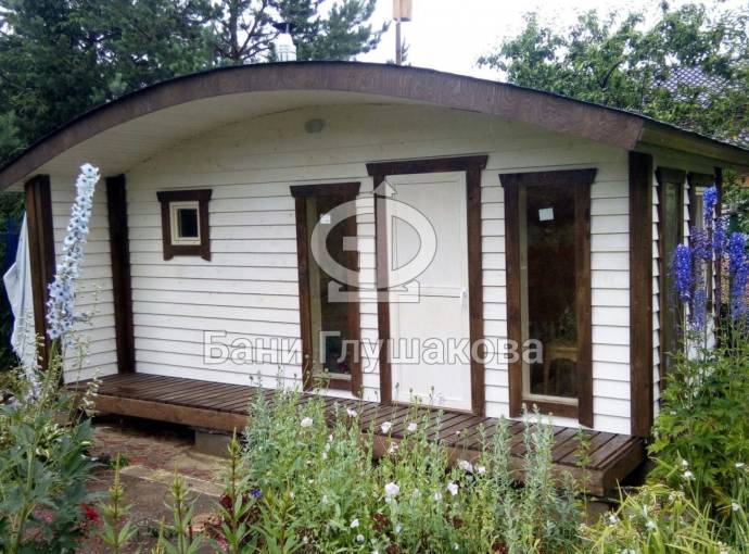 Это оригинальная разработка Дмитрия Глушакова. Баню такого вида можно заказать только в нашей компании. Эффектный дизайн получилось совместить с функциональностью:
