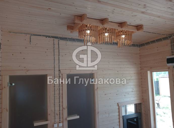 Входит в стоимость. Включает светильники в каждом помещении, вводный автомат, негорючий провод в парную, розетка в комнате отдыха (в банях-бочках розетка устанавливается по требованию).