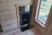 Если топка через стену то можно сделать красивые наличники из брашированной доски с полочкой на верху,