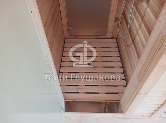 Установлен в помывочном отделении пластиковый герметичный поддон с сифоном для слива воды, в него вложен деревянный трапик (в планировках, где подразумевается душевое помещение). Ссылка на фото и видео